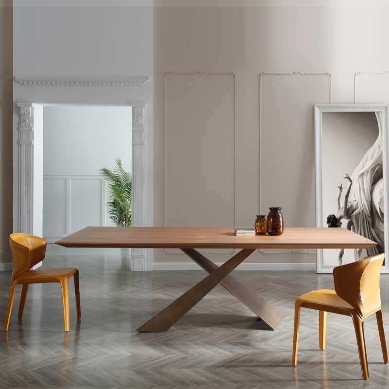 Son piétement central en forme de Y inversé assure à la fois stabilité et légèreté visuelle. Le système d'ouverture rotatif avec poignée intégrée permet un déploiement fluide de ses deux allonges, pour accueillir jusqu'à 8 convives en toute simplicité.